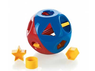 Eventually, he got to the “important” part. He opened the toy up and began to look and consider the individual shaped objects. As one would expect, he tried each object into a single slot until he found the right shape to fit. This really made him happy and was cause to celebrate. I would then coax him to do the same with the other shapes until all of them were inside the toy. Once accomplished, he loved dumping them out again and starting all over. I couldn’t believe how much this toy captured his attention. I also was pleased to see that in no time he was able to move from a trial and error approach of inserting the shaped objects to a very determined and confident manipulation of the toy to receive the object.